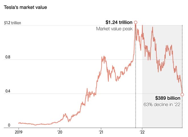 Theo báo The Wall Street Journal, Tesla đã mất khoảng 70% giá trị kể từ khi cổ phiếu của công ty đạt đỉnh vào tháng 11 năm 2021. Đây là năm tệ nhất của Tesla, kể từ khi hãng xe bắt đầu IPO.
